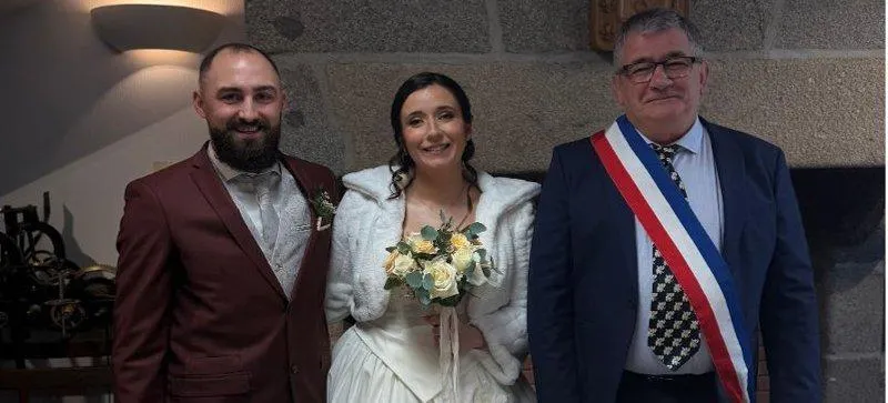 Cédric et Dorianne avec Joël Poupard, maire des Cerqueux et parrainde la mariée. © CO