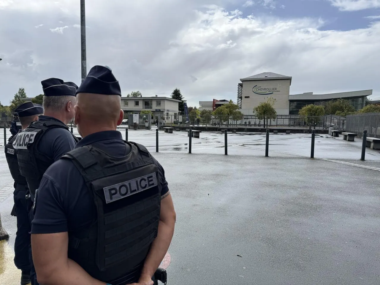 La police, ici devant le lycée Chevrollier à Angers, a sécurisé les abords des établissements scolaires. © Police nationale de Maine-et-Loire