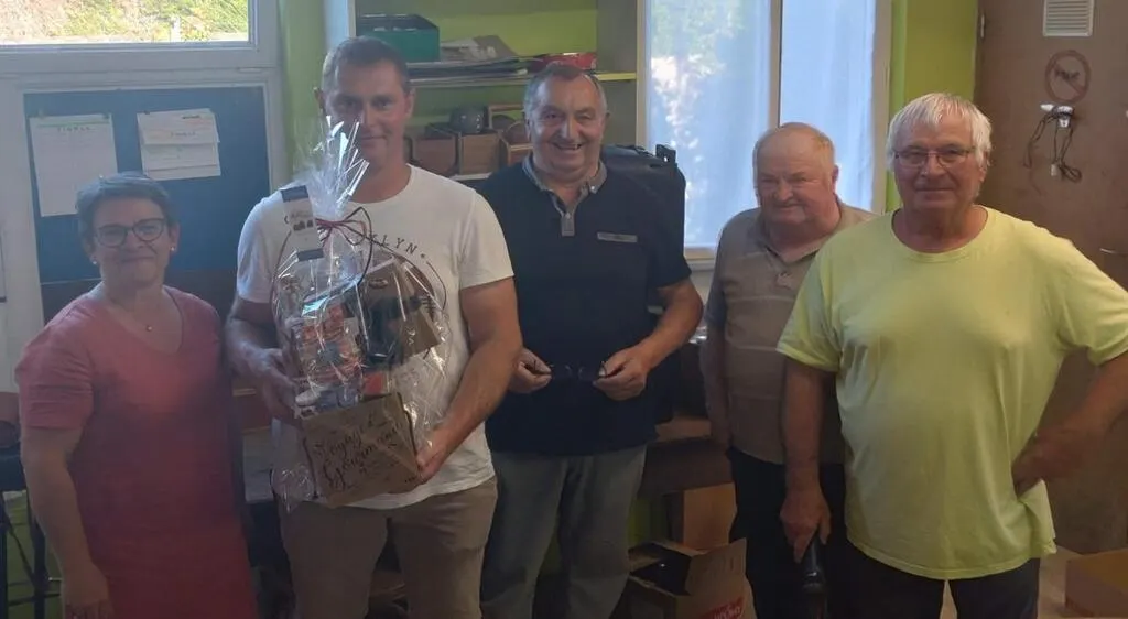 Le vainqueur Sébastien Jouanneau est entouré de Christelle Buron, du président Joël Pauleau, et en arrière-plan du trésorier M. Jouanneau et du vice-président M. Renou.