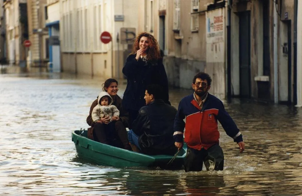 Des habitants dans une barque à Angers, en janvier 1995. © JP CAMPION/PHOTOTHÈQUE VILLE D’ANGERS