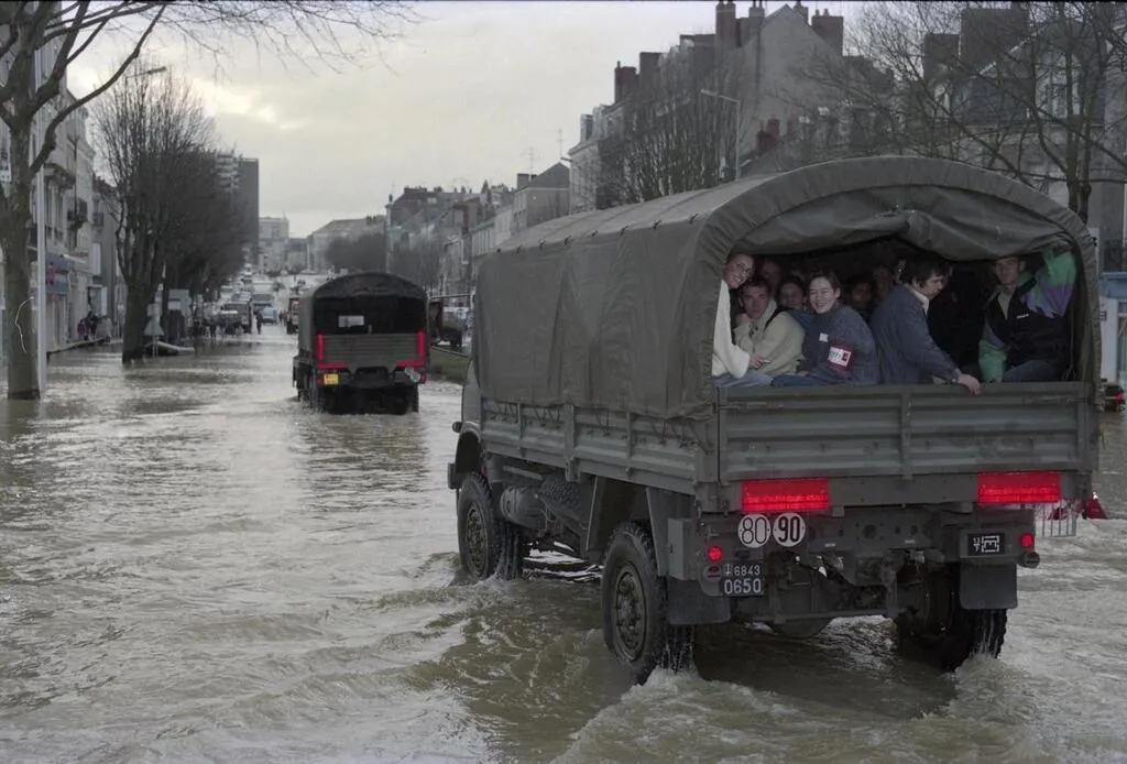 Des camions de l’armée transportent les habitants à Angers, lors des inondations. F Lemoulant/PHOTOTHÈQUE VILLE D’ANGERS