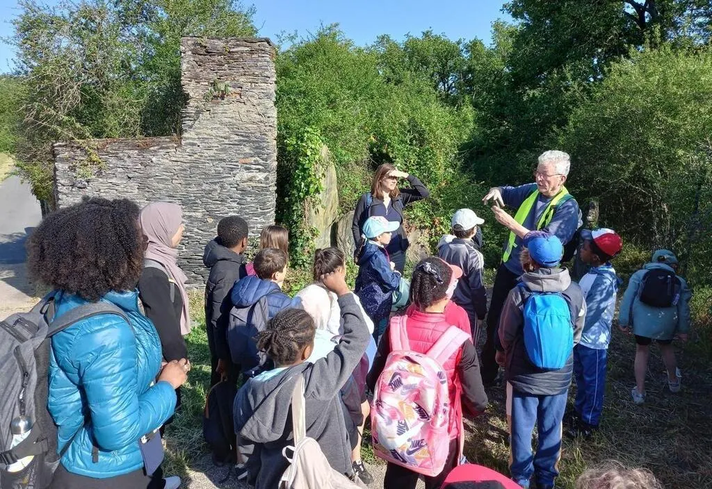 Les enfants des classes de CE2, et les parents accompagnateurs, ont beaucoup apprécié la balade commentée dans les Ardoisières. Ici, Pierre-Joël Rosier, avec les élèves de l’école Pierre-et-Marie-Curie à la Paperie © Ouest-France