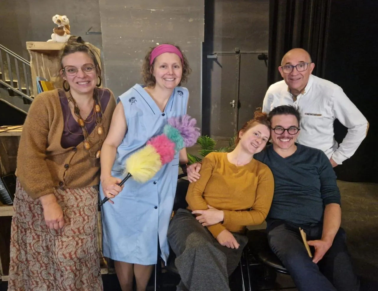 Avec la pièce de Frédéric Sabrou, « Le Tiroir de Woody Allen », c’est le thème de la création scénaristique qui est abordé. Deux créateurs en panne d’inspiration inventent les aventures d’un scénariste qui construit son histoire grâce aux papotages de sa femme de ménage. Cette comédie, mise en scène par David Ropars, présente jusqu’à douze personnages, joués par les cinq comédiens de Jugaad. Pour nous, c’est un challenge en direct sur scène !