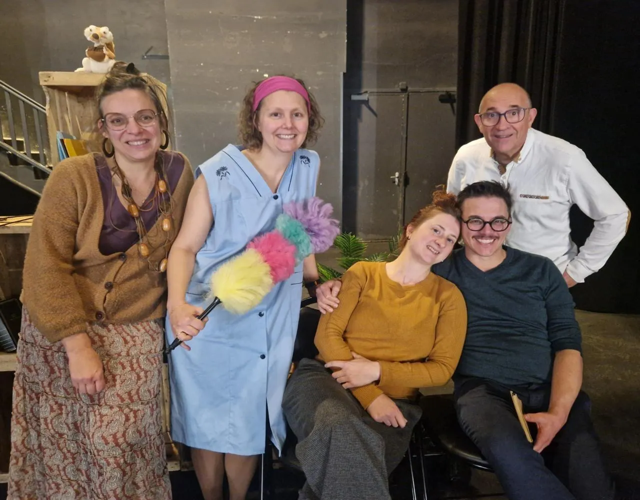 Cinq acteurs sur scène pour interpréter une quinzaine de personnages. De gauche à droite, Sandra, Nathalie, Sophie, Romuald, Stéphane. © Compagnie Jugaad
