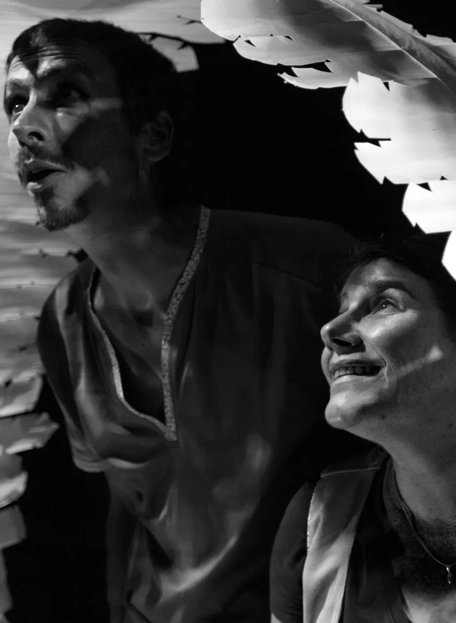 Dans un cocon de tissus et de sons, les artistes partagent un moment poétique et immersif. Les deux drôles d’oiseaux s’émerveillent d’un rien, et tout est prétexte à jouer. Les voix appellent, les mains construisent des chorégraphies dans l’espace, les corps se cherchent. La scénographie évolue sous la lumière, tandis qu’un dispositif sonore, mêlant sons naturels et bruitages, enveloppe le tout.