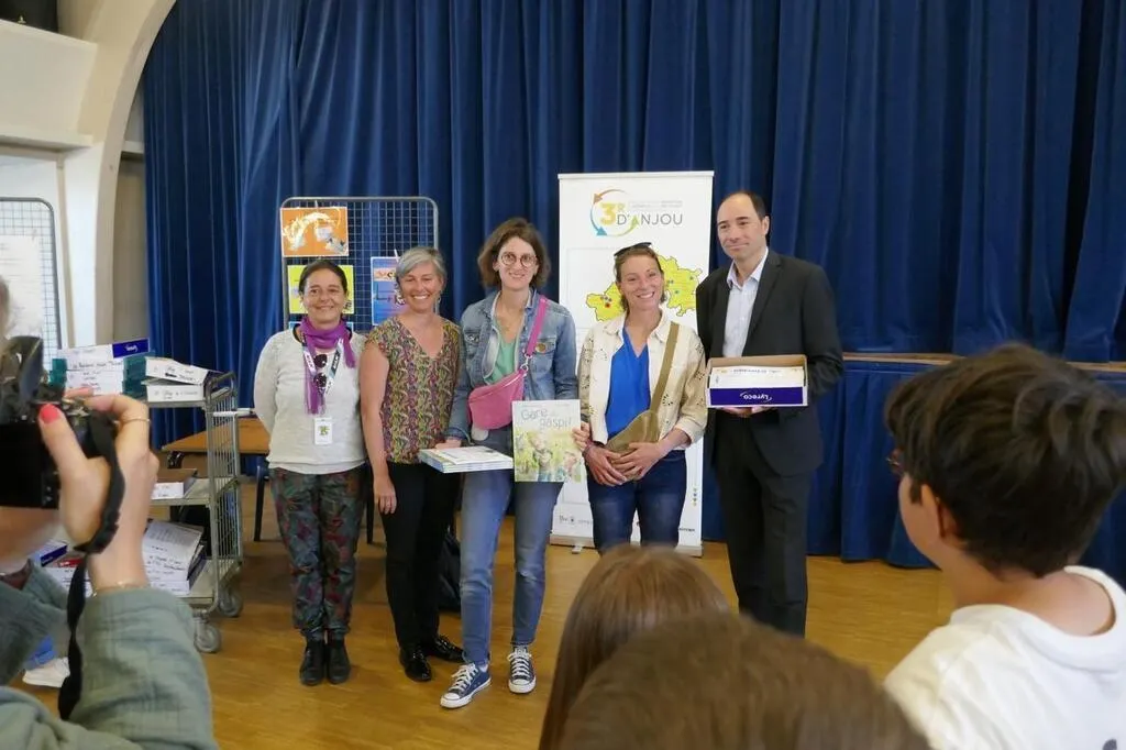 Le président du syndicat de gestion des déchets 3 RD’Anjou, David Lagleyze, et son équipe, récompensent l’école Edmond-Girard, du Lion-d’Angers, pour avoir atteint le premier échelon de la charte 3R en matière de réduction des déchets. © Ouest-France