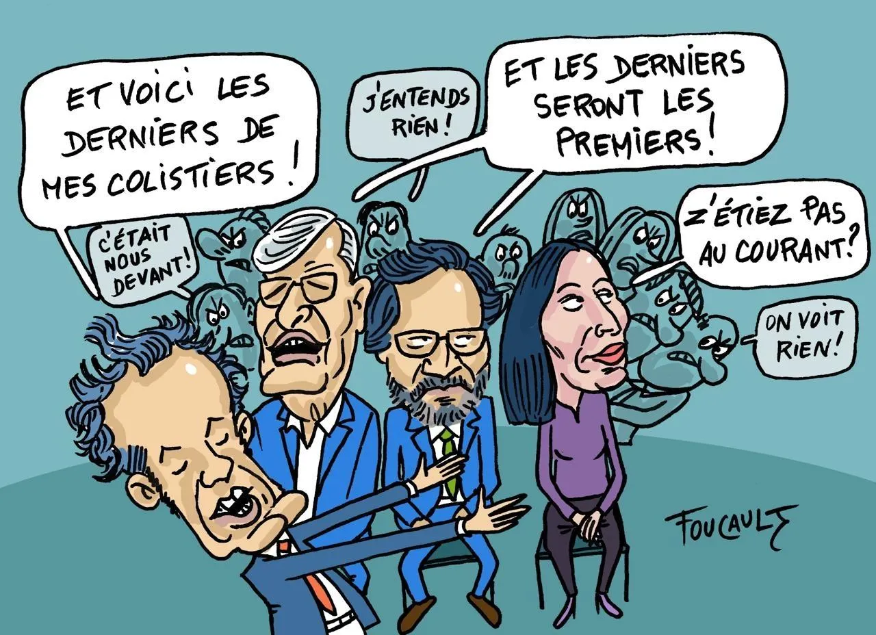 Christophe Béchu a présenté ses colistiers mercredi, en installant au premier rang ceux qui ne sont pas en position éligible. © Dessin Michel FOUCAULT