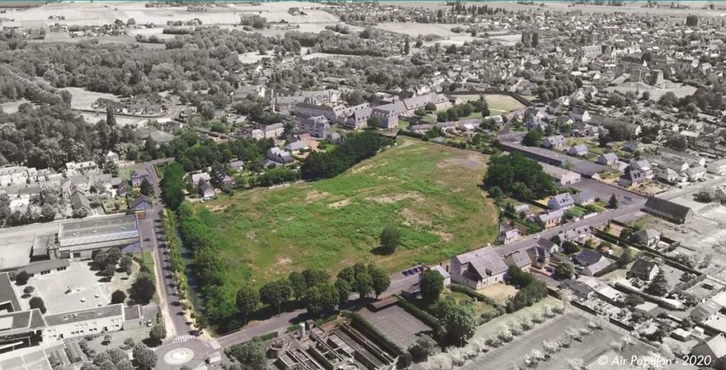 Le site désindustrialisé de France Champignon, ici vu du ciel, accueillera le quartier Montbeaume à Beaufort-en-Anjou. À gauche sur la photo, le collège Molière. © Air Papillon