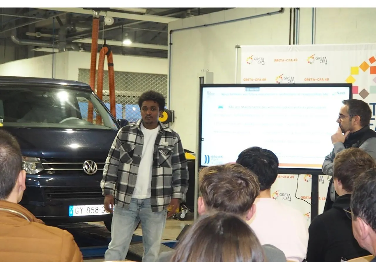 Dans l’atelier de maintenance automobile, Gizag Ataklti, venu d’Érythrée il y a 3 ans, a expliqué son parcours de formation devant une quarantaine d’entrepreneurs de la filière automobile. © CO
