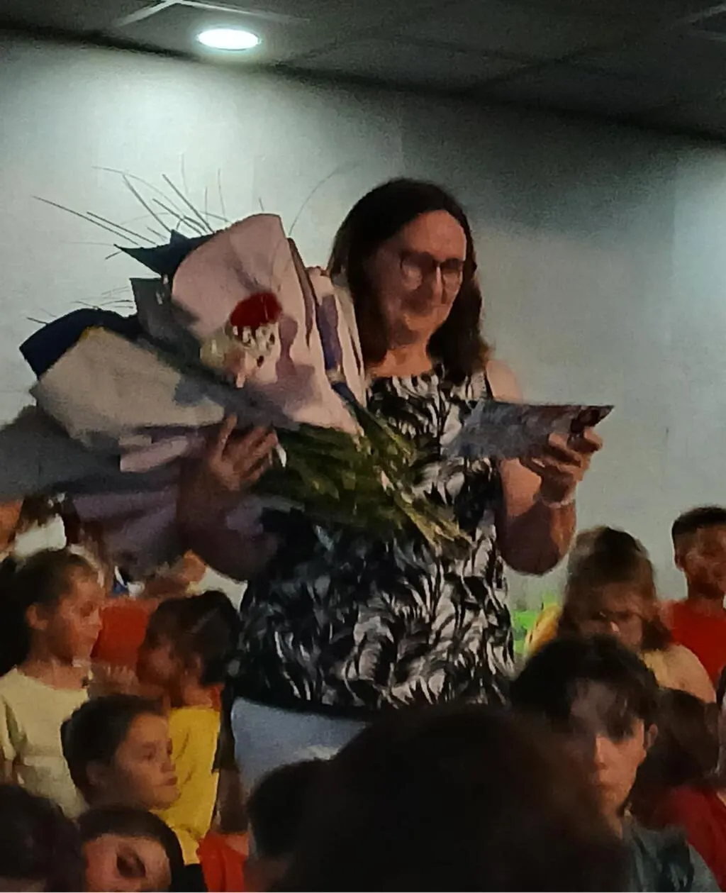 Un joli moment d’émotion pour la nouvelle retraitée entourée de ses élèves lors de la fête d’école. © CR