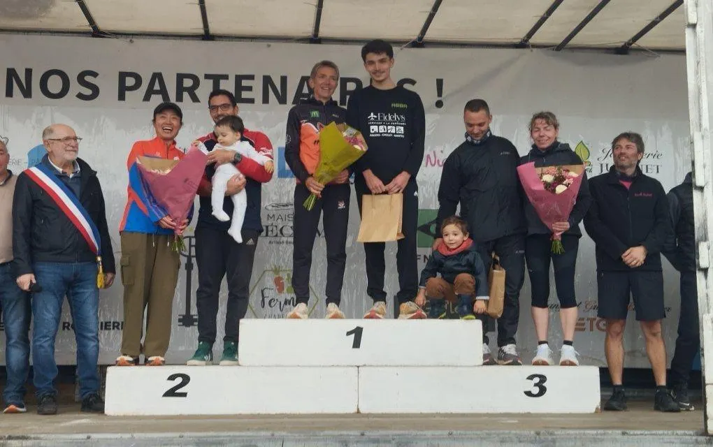 Le podium de la course des 10 km : Catherine Thomas Pesqueux et Tristan Guérin sur la première marche, Chunmei Lopez et Sylvain Caquineau sur la deuxième, Virginie Herry et Yohan Lacrouts sur la troisième. © CO