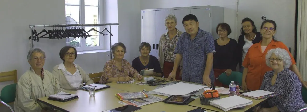 Cao Bei-An enseigne l’art de l’aquarelle. Élisabeth Labbé (3e à gauche) est la créatrice de l’association l’Aquatelier de La Daguenière. © CO.