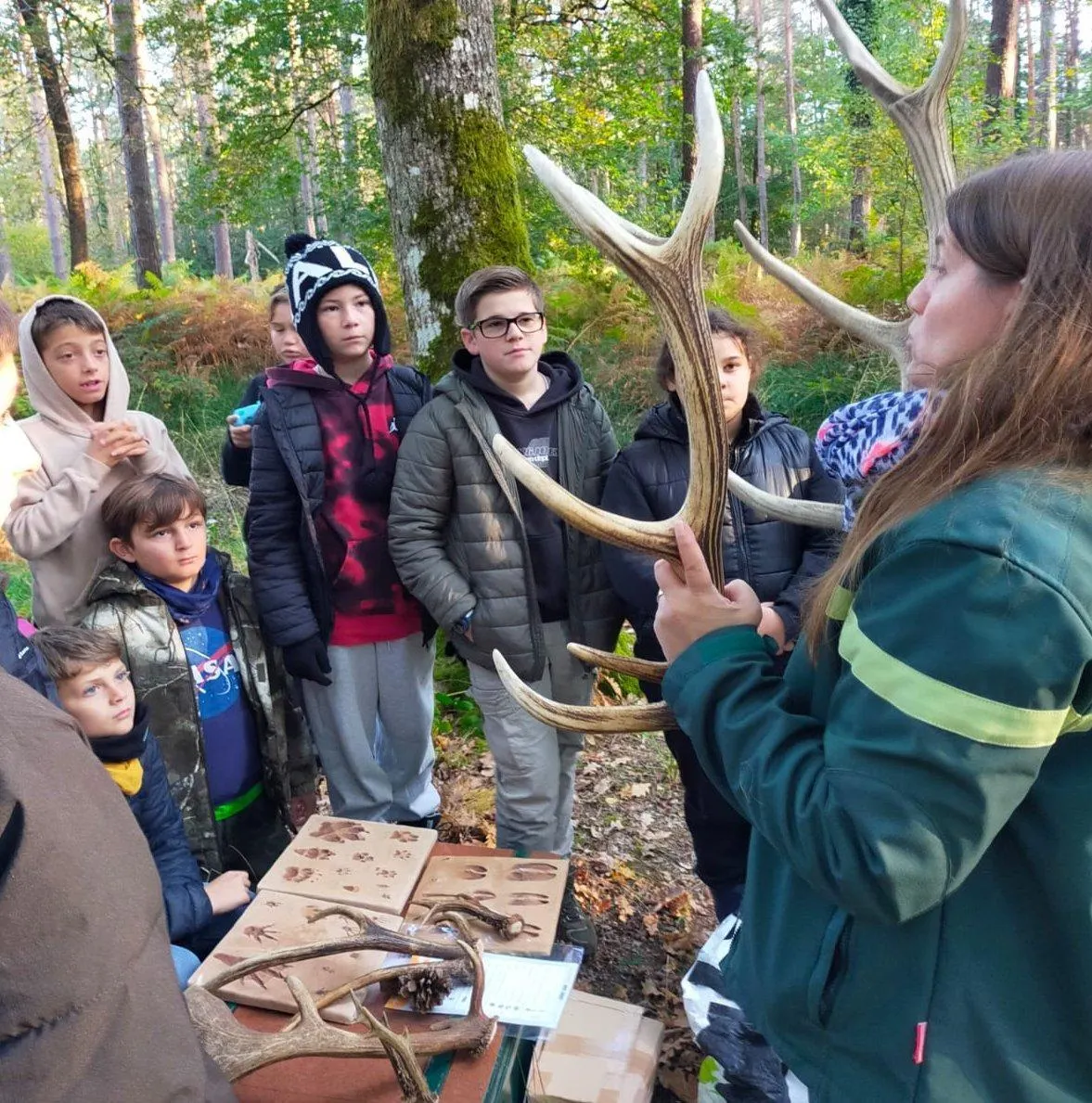 Tifenn leur a fait découvrir, à partir de moulages d’empreintes, de bois de cerf, de crânes de chevreuil, les animaux qui composent la faune de nos forêts. Puis, Manuel s’est attelé à leur présenter les différentes missions du forestier, la nécessité de couper les arbres par mesure de sécurité, pour aider chacun à trouver sa place dans cette compétition pour l’eau et la lumière.