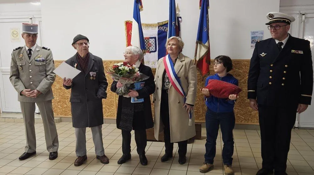 De gauche à droite : le major David, l’ancien président de l’UNC-AFN Alain Pineau et son épouse Andrée, Florence Lucas, maire déléguée, Émile et le maître principal Christophe. © Ouest-France