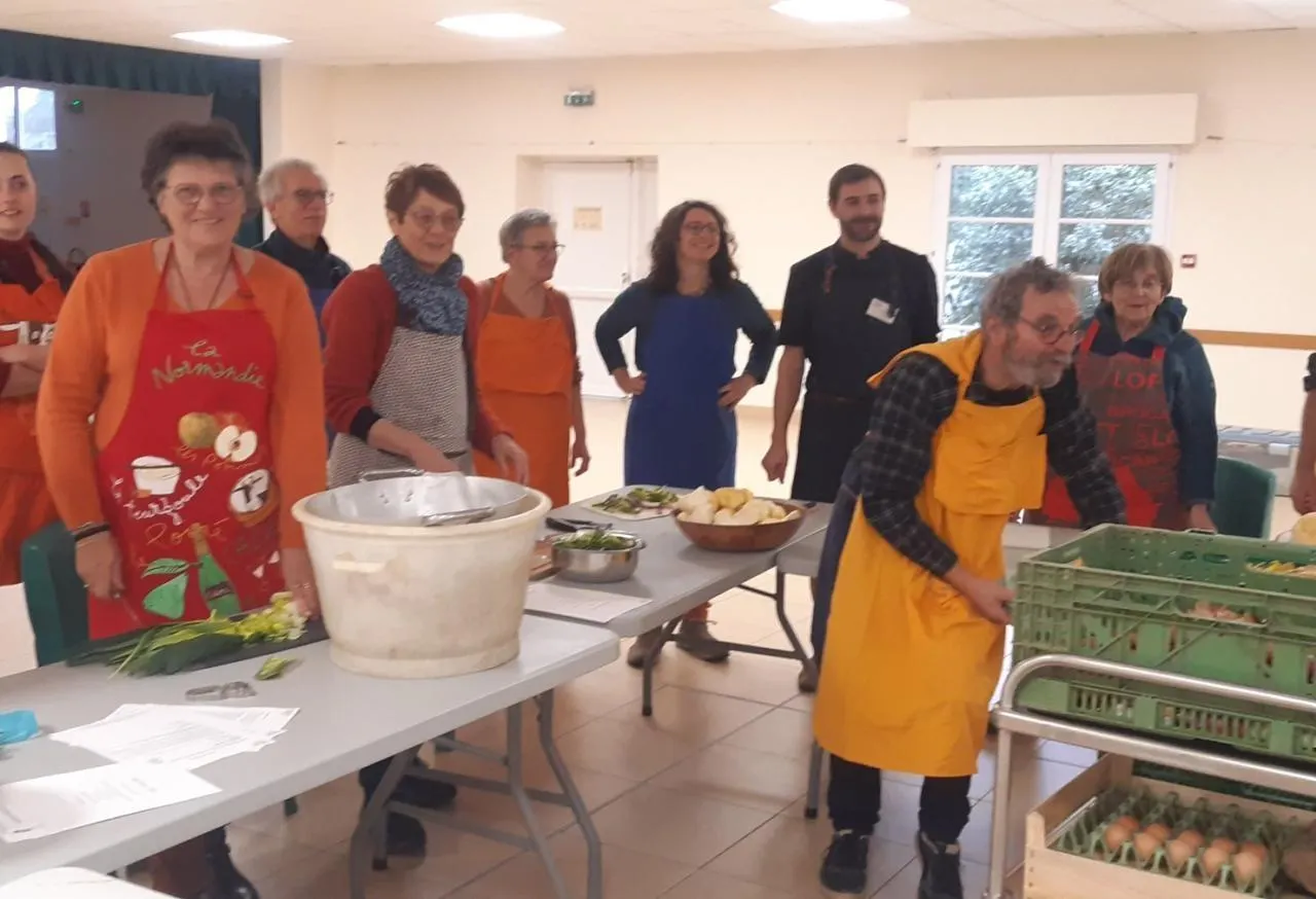 Les volontaires ont partagé leur savoir-faire en cuisine avec le chef Anthony Routhiau (au centre en second plan). © Ouest-France