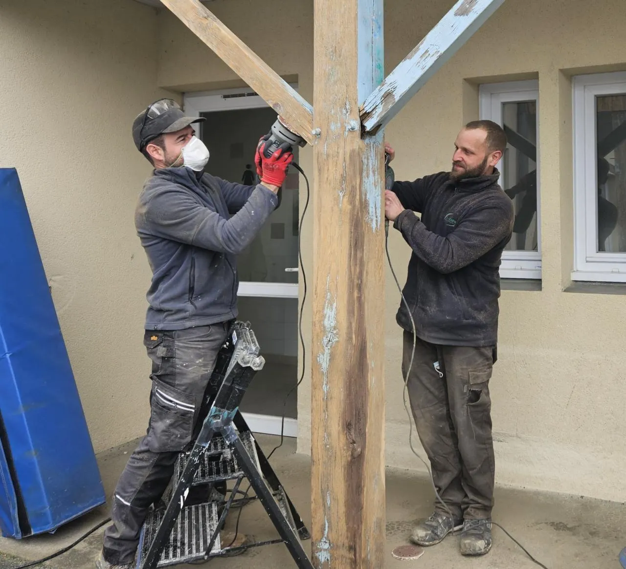 Deux pères de famille, s’activent au ponçage avant les nouvelles peintures. © CO