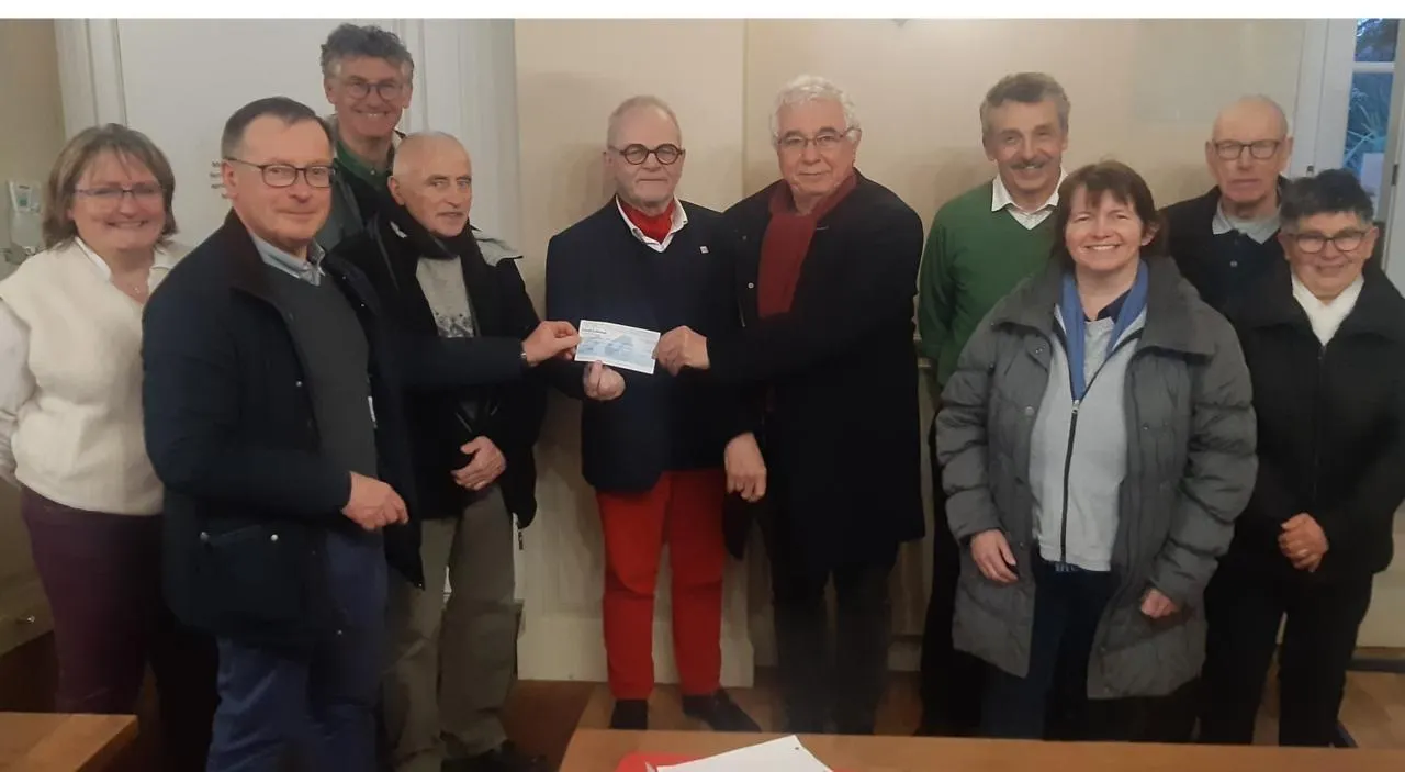 Hervé Racat, devant à gauche, et Jean-Pierre Beaussier, qui reçoit le chèque des mains de Jean-Hugues Soret, curé de la Paroisse Saint-Jean XXIII. © CO