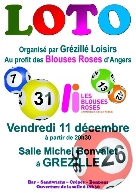 Loto organisé par Grézillé Loisirs au profit des Blouses Roses d'Angers, vendredi 11 décembre à partir de 20h30. Salle Michel Bonvalet à Grézillé