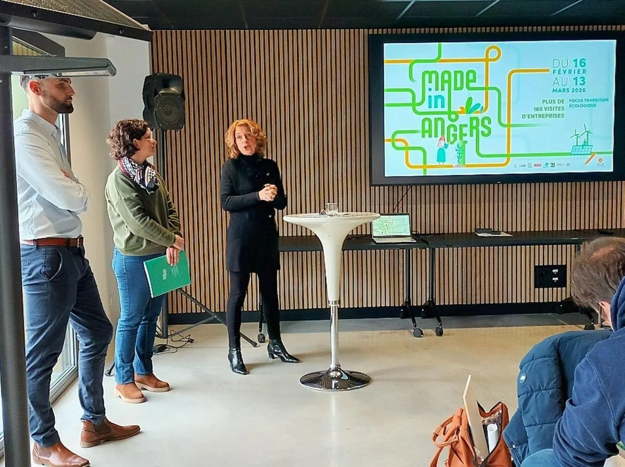 De gauche à droite : dans les locaux de Novéa énergies, Johan Delumeau et Claire Moutray, chargée des projets évènements à Destination Angers, aux côtés de Véronique Maillet, qui a lancé l’évènement en mettant en avant les focus 2026 : transition écologique, métiers et entreprises sociales et solidaires. © Ouest-France