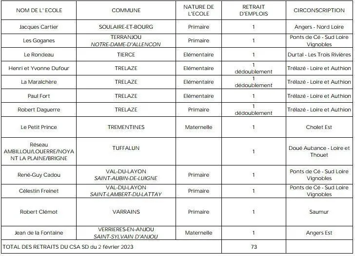 Les classes concernées par des fermetures de classes à la rentrée de septembre 2023 en Maine-et-Loire. INSPECTION ACADEMIQUE