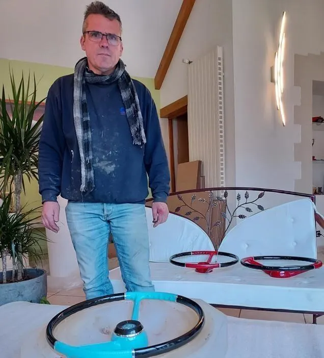 Stéphane Martin a installé sa petite entreprise Néo Prototypes dans différents petits ateliers, chez lui. Spécialisé dans la fabrication de pièces détachées pour les collectionneurs de voitures anciennes dont la production industrielle de ces pièces a été abandonnée, il présente ici le moule qui sert à couler la résine nécessaire à la confection des volants de ces voitures anciennes. © Ouest-France