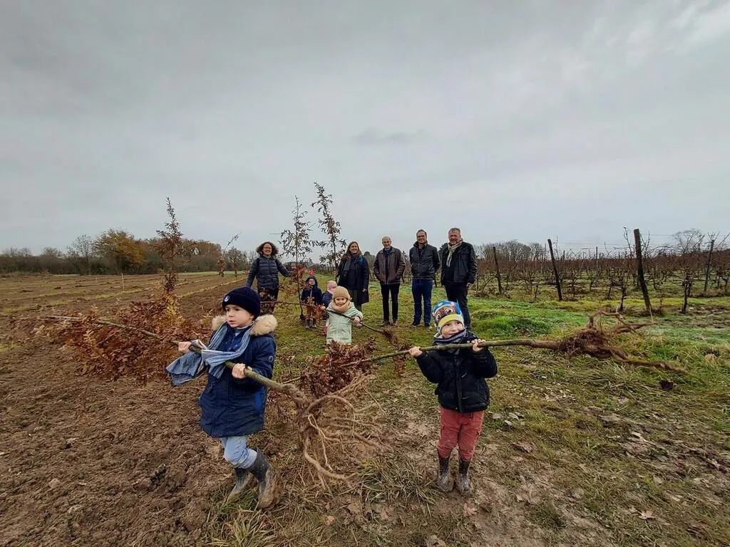 Le domaine Haute-Perche a lancé un projet en lien avec les écoles locales. Ici, les élèves de l’école Condorcet de Soulaines-sur-Aubance apportent leur aide à la plantation, avec l’aide de parents d’élèves et de leurs professeures. © Ouest-France