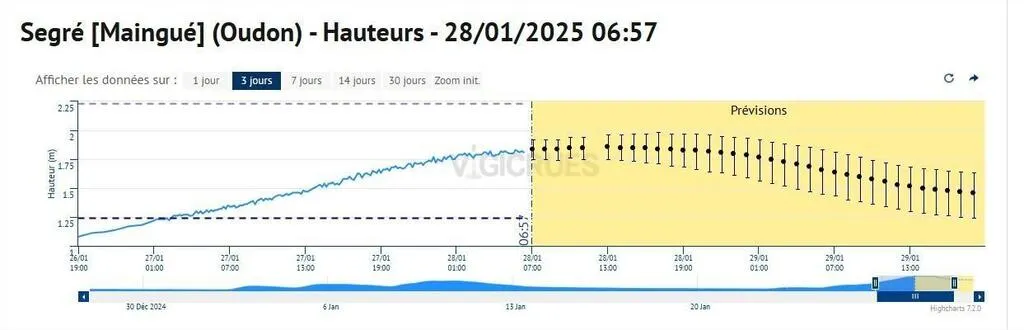 Le Maine-et-Loire est placé en vigilance orange pour les crues jusqu’au mercredi 29 janvier. Les pluies devraient se faire plus rares ce mardi à partir de 10 h, notamment dans le secteur de Segré, le point sensible du département. Plus d’une trentaine d’habitations y sont d’ailleurs touchées par la montée des eaux. S’agissant des routes, cinq d’entre elles sont coupées à la circulation en raison des inondations.