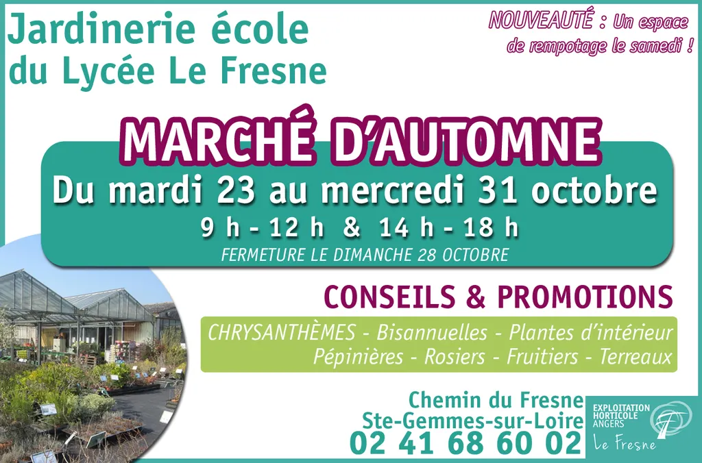 C'est l'automne ! La jardinerie école du lycée Le Fresne à Angers fait son marché d'automne du lundi 23 au mercredi 31 octobre 2018 (de 9h à 12h et de 14h à 18h).