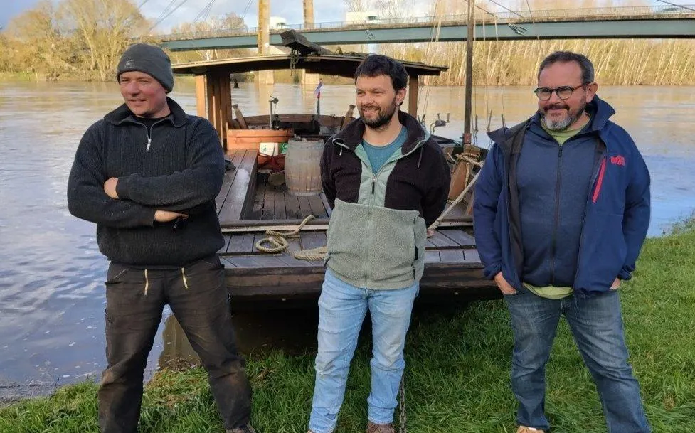 En bord de Loire à Saint Florent-le-Vieil, Sébastien Boudin, Matthieu Perraud et Giovanni devant l’une des toues de croisière sur le fleuve. © CO