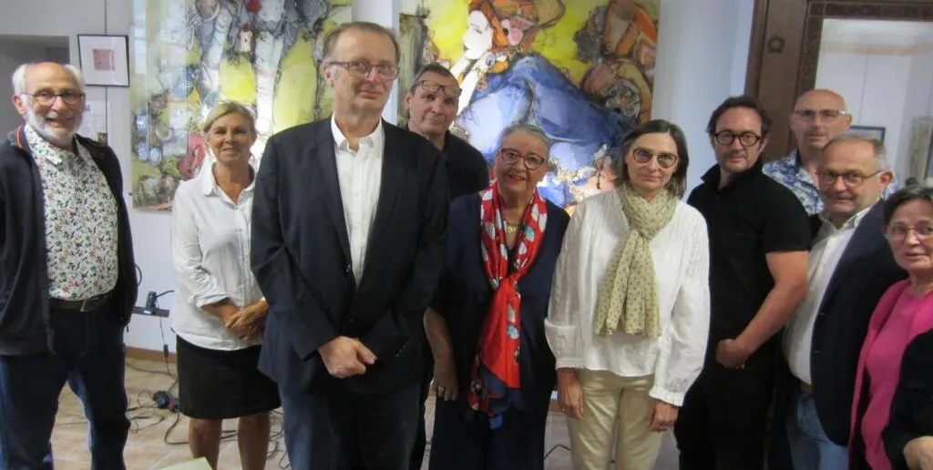 Artistes, élus, bénévoles de l’association près du président Eric Wagner (au centre). Ségolène Calmet et David Roland (4e et 5e à partir de la droite) sont les invités d’honneur de l’exposition. © CO