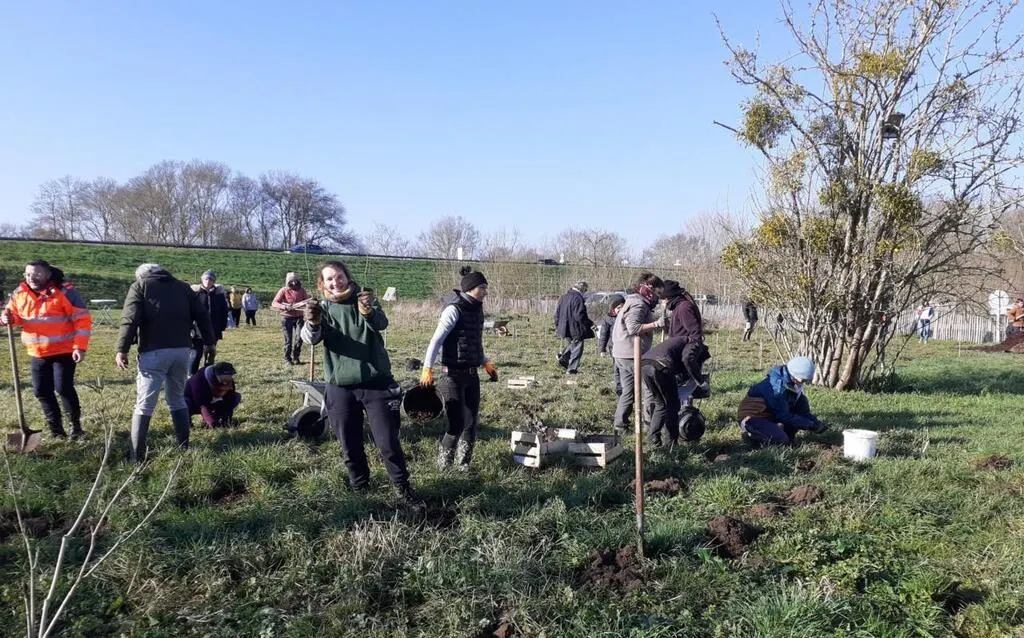 L’association les Pics Verts et des bénévoles lors de la plantation de la microforêt à La Ménitré en 2022 © Archives CO