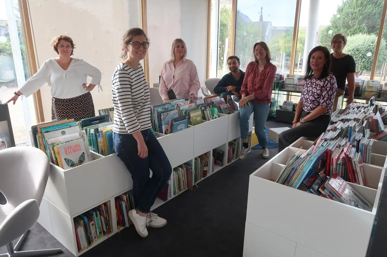 Mazé, le 29 août 2025. L’équipe des médiathécaires de La Bulle au grand complet, accompagnée de Laure Lemallier, dans le nouvel espace dédié à la bande dessinée. © CO – Agathe LE NUEFF