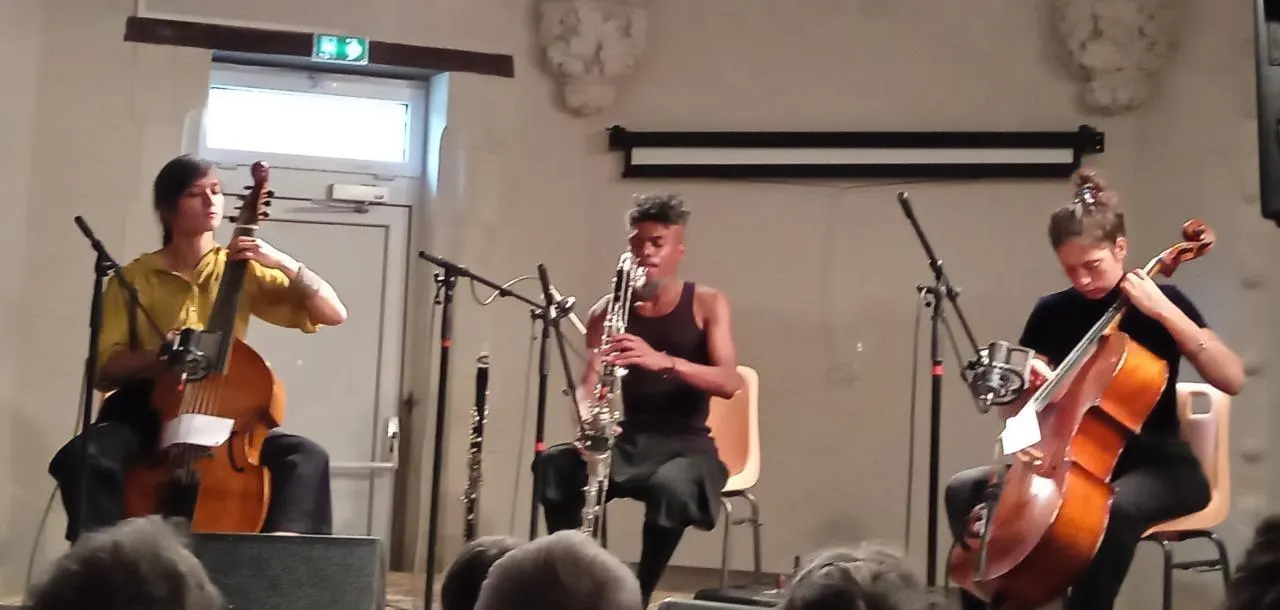 Pour l’occasion, le trio Atrium, réunissant le clarinettiste Julien Stella, Marie Suzanne De Loye à la viole de gambe et Lina Belaid au violoncelle, a fait résonner des notes uniques. Car ce trio n’hésite pas à tester tous les sons qui peuvent sortir de leurs instruments. Pour un morceau, ils ont ainsi inséré des feuilles de papier entre les cordes, faisant découvrir des tonalités originales. Pour un autre, violoncelle et viole de gambe ont été tenus comme des guitares aux cordes pincées.