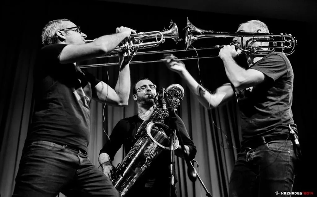 Le trio de cuivres Journal intime ouvrira le festival, en compagnie du percussionniste congolais Fabe Beaurel Bambi, ce dimanche 22 juin au jardin de l’Apostrophe. © Aleksey Kaznadey