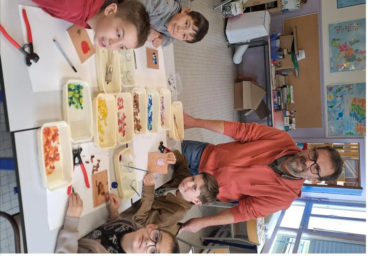 Lors d’une première séance, le mosaïste mazéiais Christophe Froidefond est venu présenter aux élèves l’histoire de la mosaïque, de l’antiquité à nos jours, ainsi que les techniques et les outils utilisés.