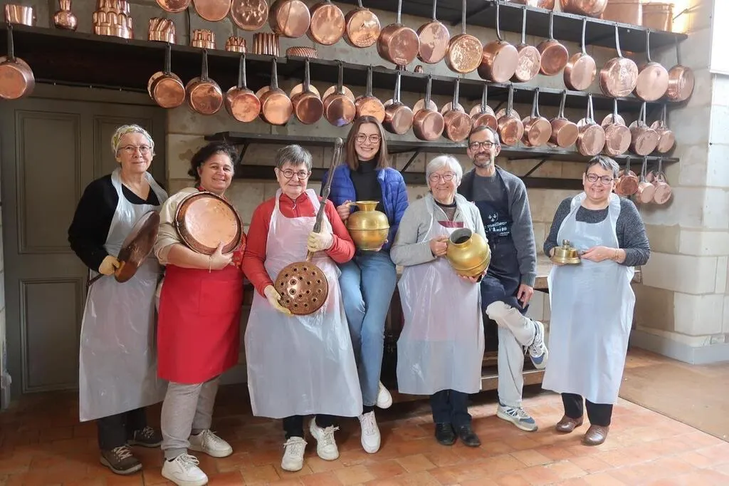 Mazé, le 24 mars 2025. Autour du régisseur Jérôme Boulidard et de la médiatrice culturelle Louise Chouteau, les bénévoles des Amis de Montgeoffroy s’activent pour remettre le château en beauté avant l’ouverture. Aujourd’hui, c’est lustrage de l’impressionnante collection de cuivres en cuisine. © CO – Agathe LE NUEFF