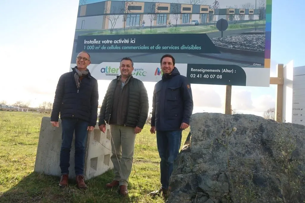Mazé-Milon, le 2 décembre 2024. Le maire Christophe Pot, entouré de Vincent Gaboriau, vice-président en charge du développement économique à la communauté de communes Baugeois-Vallée, et de Guillaume Leclerc, de l’agence saumuroise d’Alter qui porte le projet. © Agathe LE NUEFF