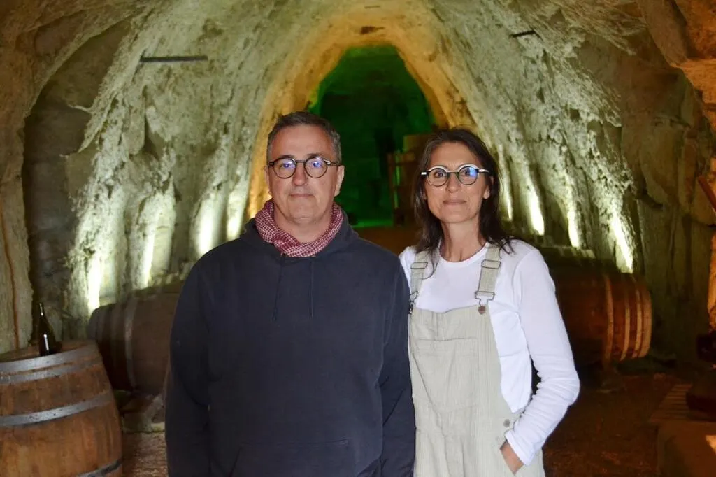 Distré, mardi 23 avril 2024. Gérald et Sarah Jane Beaumont, nouveaux propriétaires des lieux, dans l’impressionnante cave qu’ils veulent faire revivre. © CO – Carl GUILLET