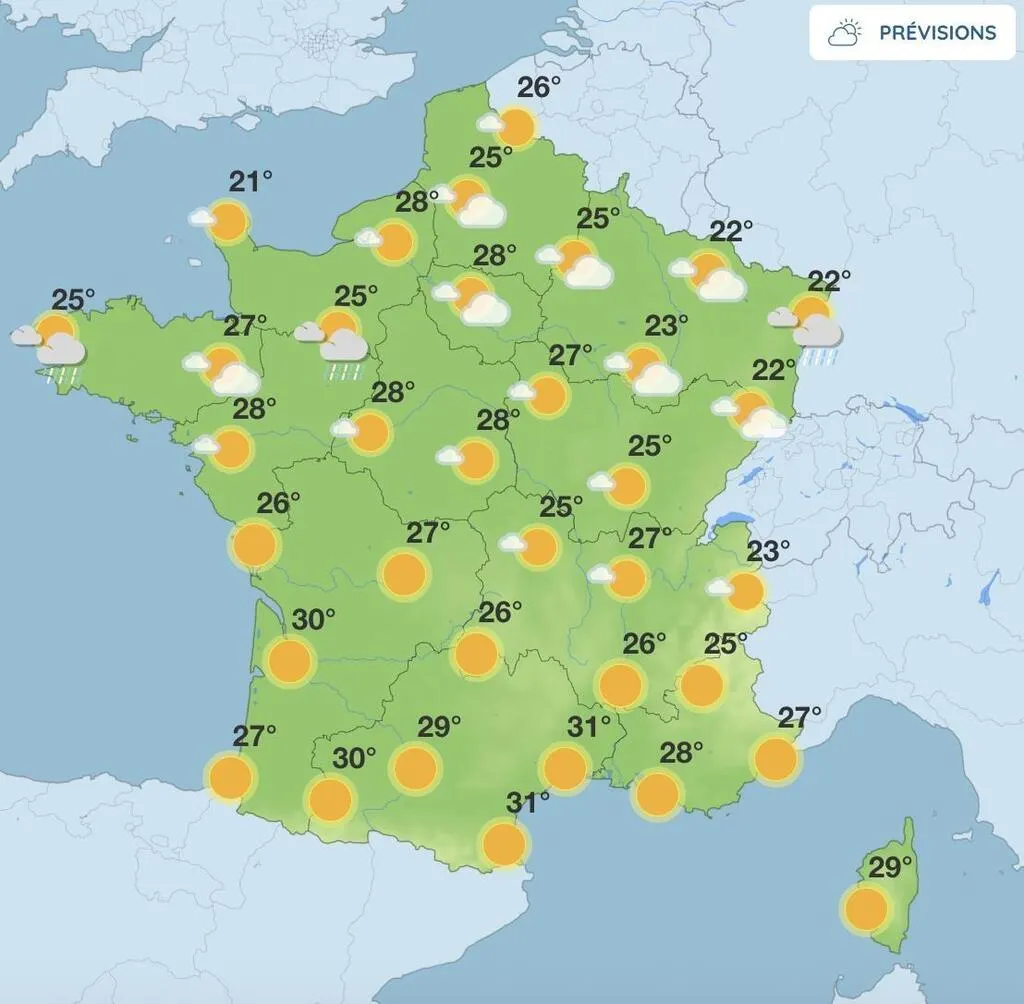 En fin de mois (semaine du 21 au 27 juillet), l’anticyclone pourrait s’affaiblir, laissant place à un temps plus instable, avec un risque d’orages parfois marqués, surtout sur le sud et l’est du pays.