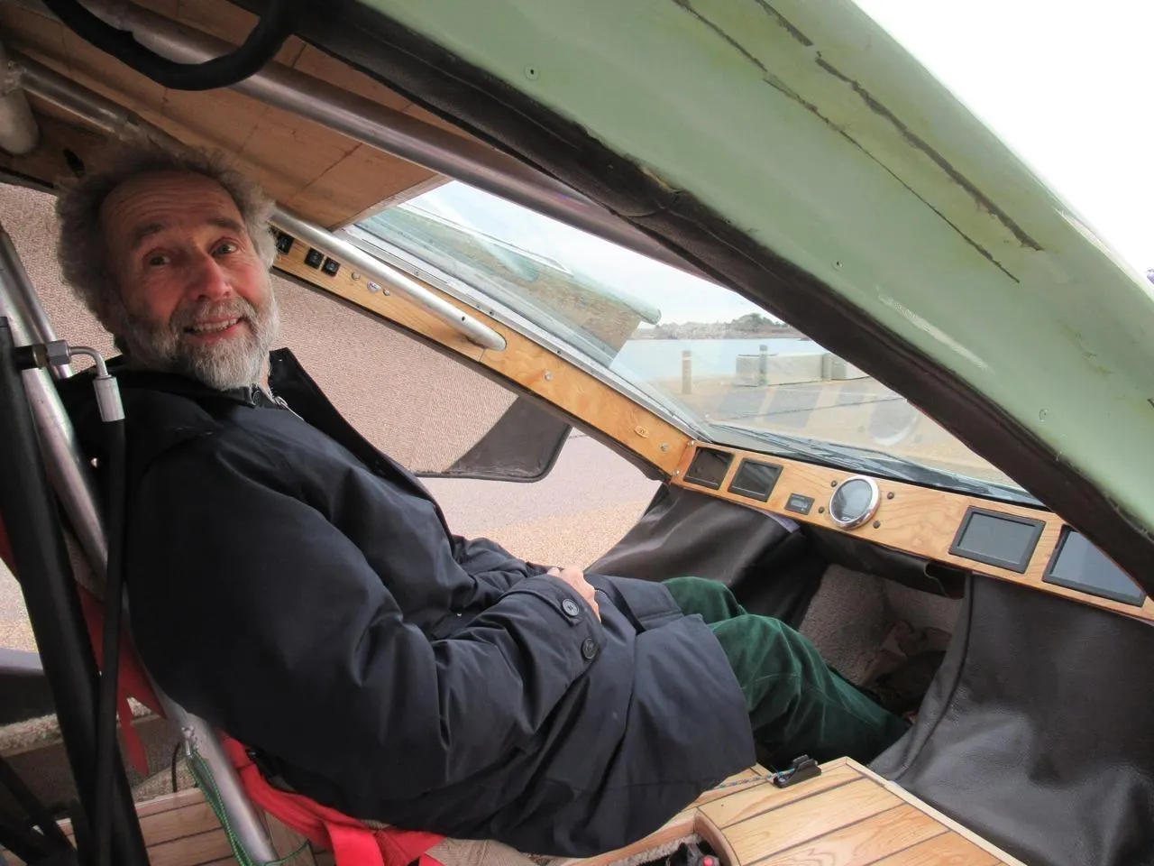 Denis Baulier et sa Scaramobile tous panneaux déployés avant sa mise en route, tout en silence, pour effectuer un aller-retour sur le boulevard de la Mer à Port-Blanc. © Ouest-France