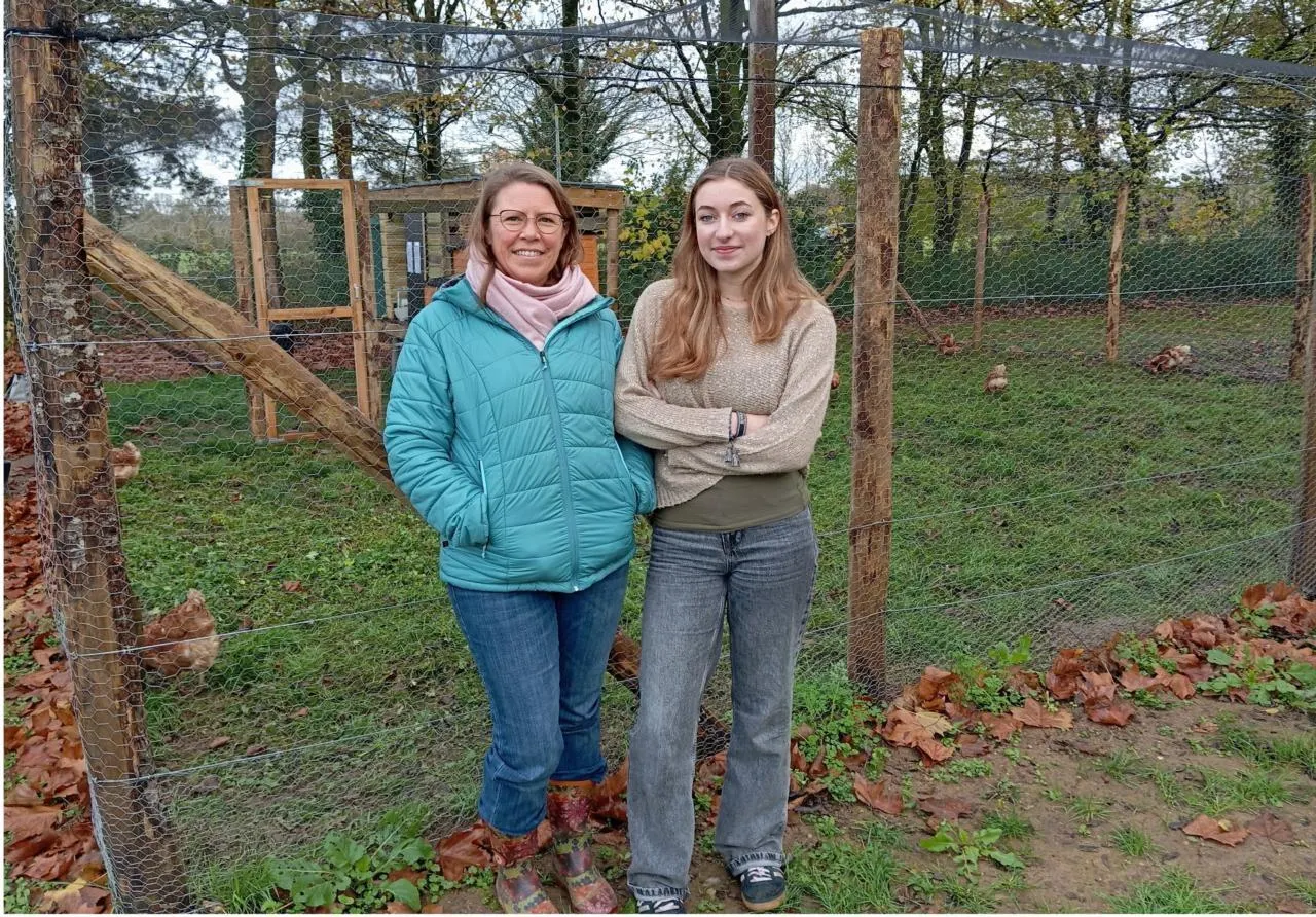 De g. à dr. : la trésorière d’Happy transition, Delphine Leleu, et Lucie Bernier, à l’initiative de ce poulailler partagé collectif. © CO
