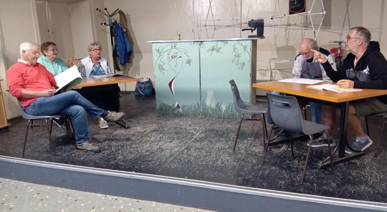 De gauche à droite : Alain, Françoise, Sylvie, Bernard et Alain Rayer les comédiens et comédiennes en répétition dans la salle Jean-Rostand. © CO.