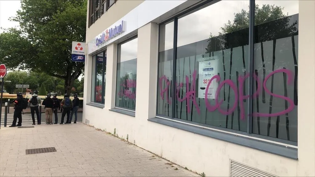 Des tags et des dégradations sont en cours, ce vendredi 30 juin, aux abords de l’hôtel de ville d’Angers. Chloé Bossard