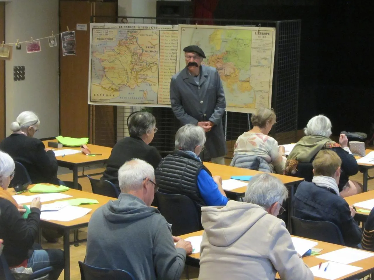 Saint-Martin-du-Fouilloux (Maine-et-Loire), salle Barbara, le 3 octobre 2025. Le maître d’école a recréé une ambiance d’autrefois. Les élèves aux cheveux gris ou blancs ont creusé leurs méninges et fait preuve de bon sens et de belles connaissances à peine émoussées. © CO