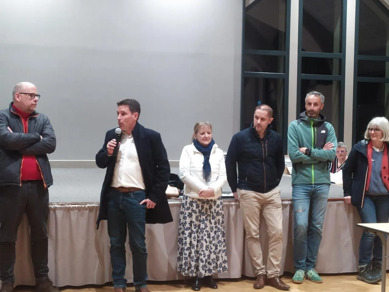 Stéphane Jeannneteau lors de sa prise de parole après l’annonce des résultats. De gauche à droite : Marc Berjon, Stéphane Jeanneteau, Monique Greffier, Mathieu Chastrey, Christophe Daniel et Annabelle Gautier. © Ouest-France.
