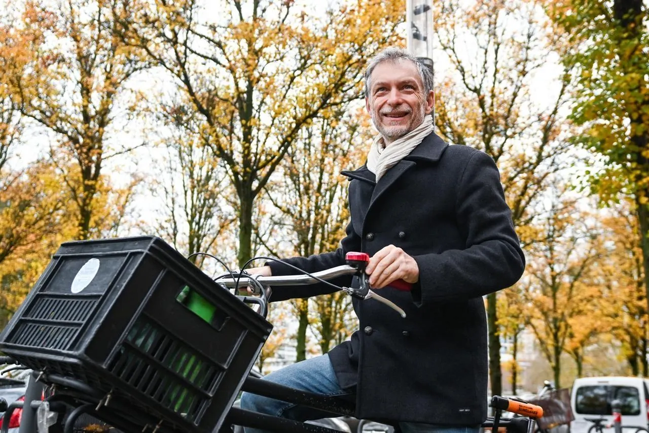 Stéphane Baly à vélo dans les rues de Lille, en novembre 2024. © ADRIEN FILLON / Hans Lucas via AFP