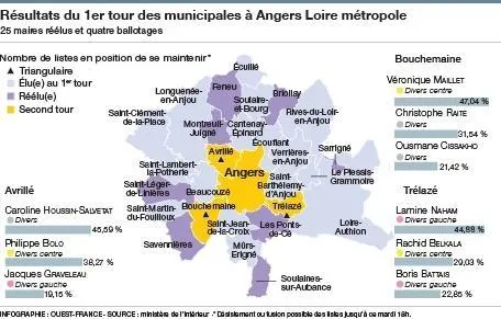 Quels sont les enseignements à tirer du premier tour des élections municipales dans l’agglomération d’Angers (Maine-et-Loire) ? À côté du coup de tonnerre de Loire-Authion où le maire sortant, Jean-Charles Prono, a été battu, les surprises ont été nombreuses. Surtout pour la gauche qui perd plusieurs villes. Avrillé, Bouchemaine et Trélazé sont les seules communes qui connaîtront un second tour.