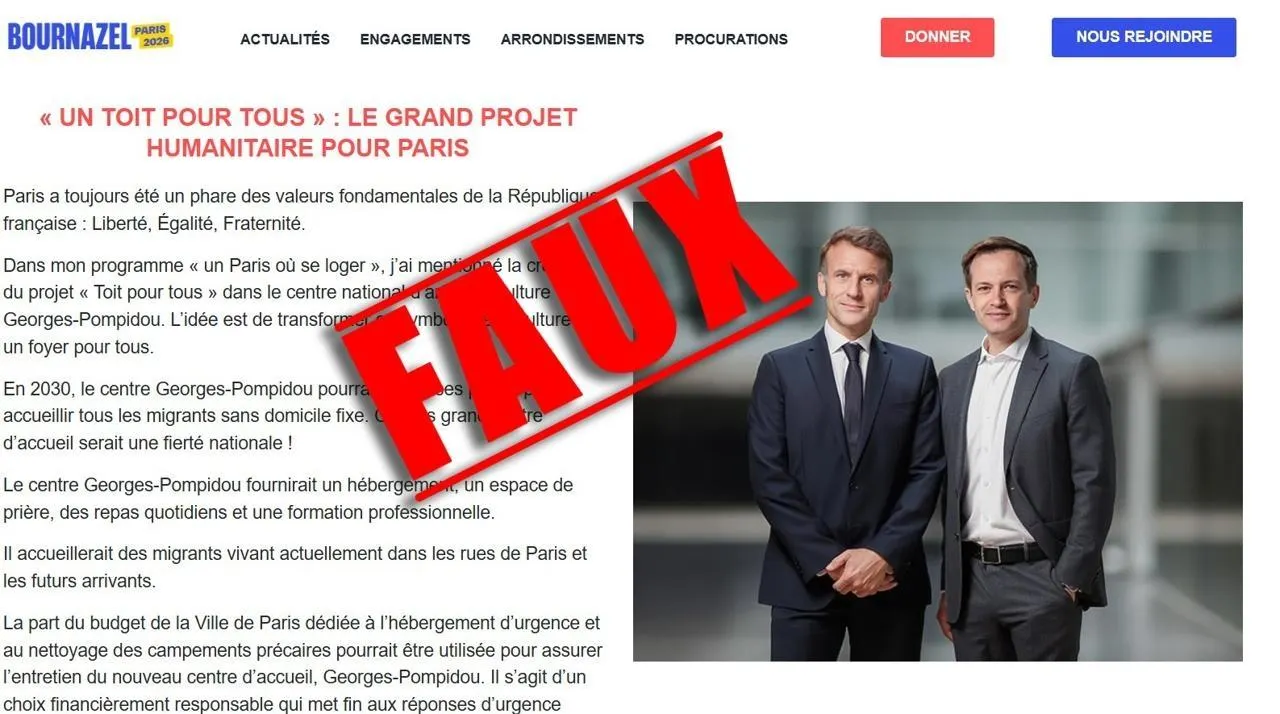 Une vidéo de quelques dizaines de secondes y prétend que Pierre-Yves Bournazel veut fermer le musée Centre Pompidou à Paris pour le transformer en centre géant d’accueil de migrants. « En 2030, le centre Georges-Pompidou pourrait ouvrir ses portes pour accueillir tous les migrants sans domicile fixe. Ce plus grand centre d’accueil serait une fierté nationale ! » renchérit également un faux site reprenant les codes visuels du site de campagne de Pierre-Yves Bournazel. Non seulement il y ressemble mais, lorsqu’on clique sur les différentes rubriques, on est redirigé sans s’en rendre compte vers le véritable site de campagne de Pierre-Yves Bournazel. Si l’on ne prend pas garde à l’URL (l’adresse web), la navigation reste fluide si bien que la fausse page se confond avec les véritables pages du candidat.