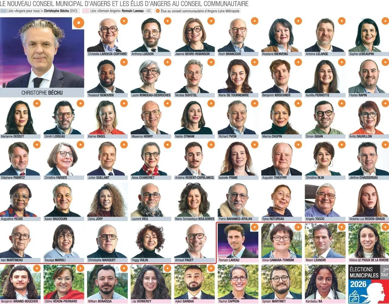 Le nouveau conseil municipal d’Angers sorti des urnes ce dimanche 22 mars 2026 est renouvelé, tant dans la majorité de Christophe Béchu que dans le groupe d’opposition de Romain Laveau.
