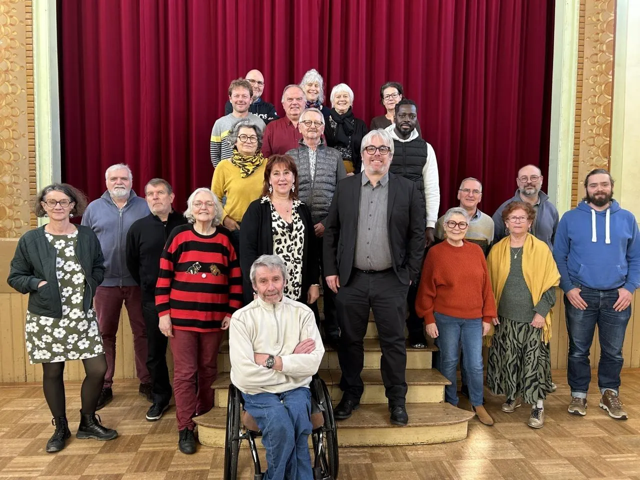 photo  trélazé, salle de la maraîchère, samedi 7 février 2026. une partie des membres de la liste trélazéen-nes agissons ensemble (tae) qui a pour figure de proue boris battais (avec une veste noire au centre)  ©  co-fabienne supiot 2